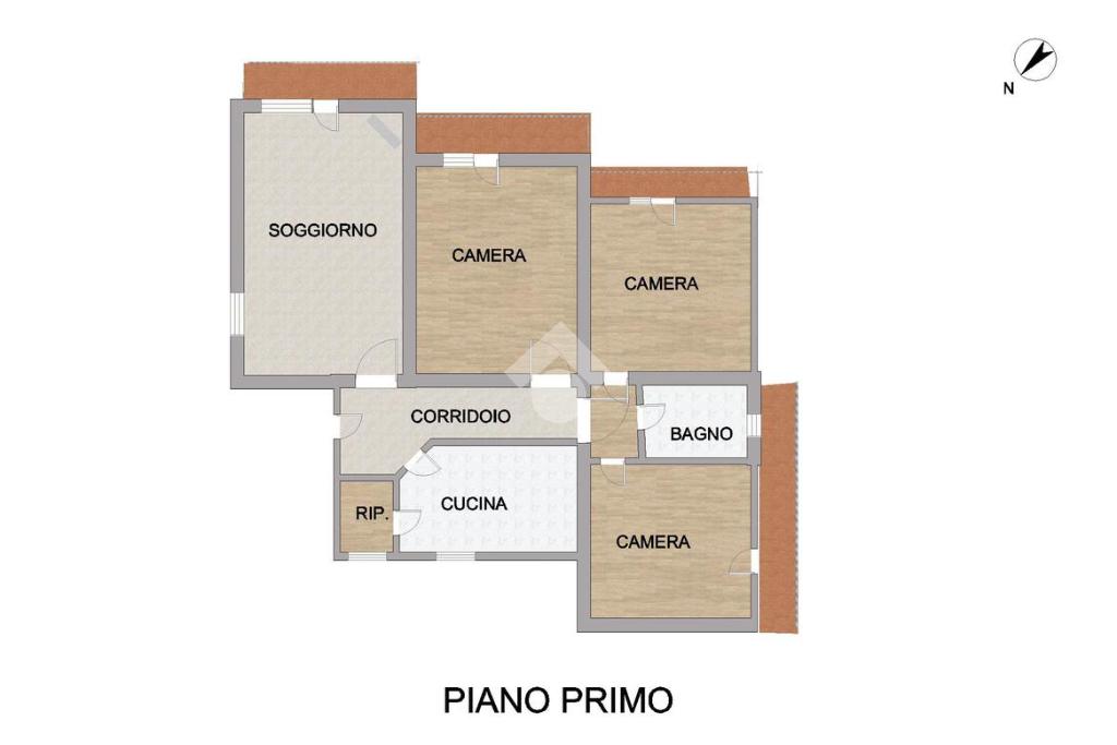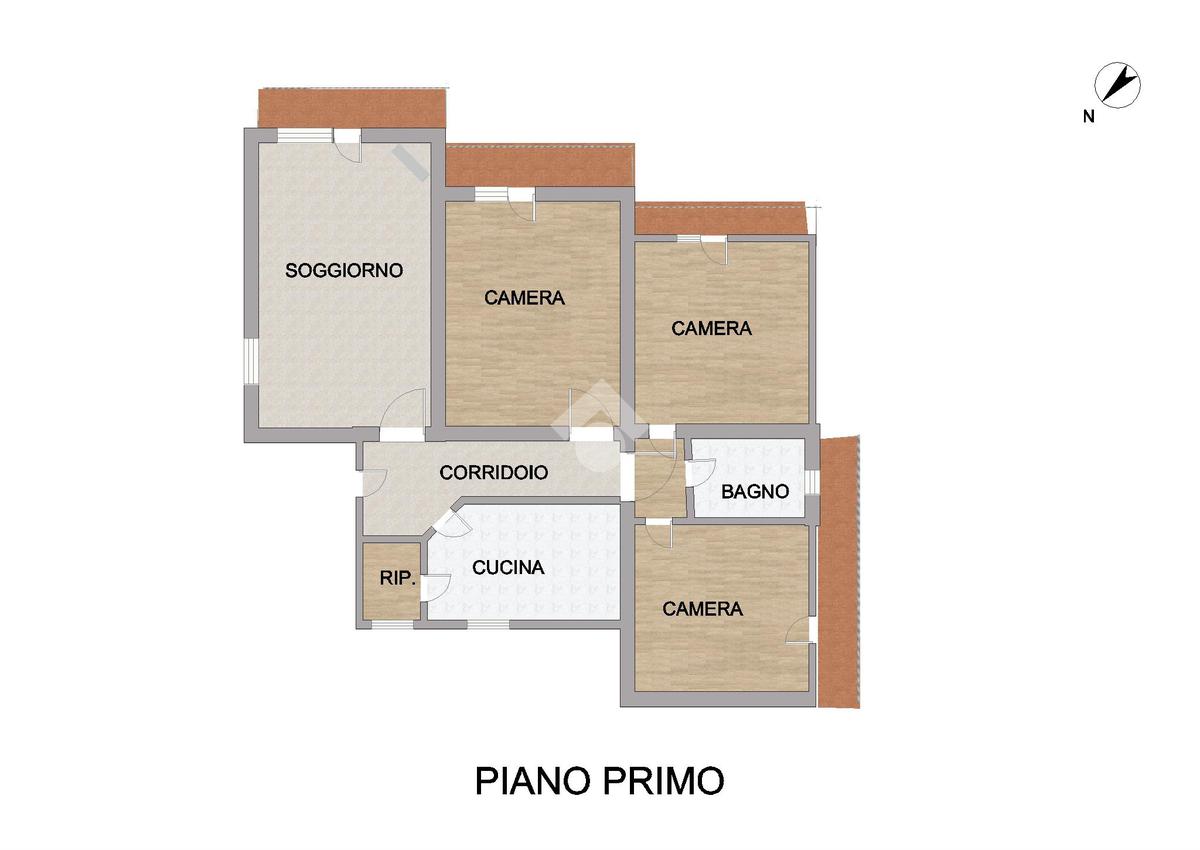 Ingresso(5mq), Soggiorno con camino(27mq) cucina abitabile(12mq), ripostiglio interno(2mq), corridoio(8mq) Camera(21mq), camera(18mq) camera(15mq), bagno con finestra e vasca(5,6);